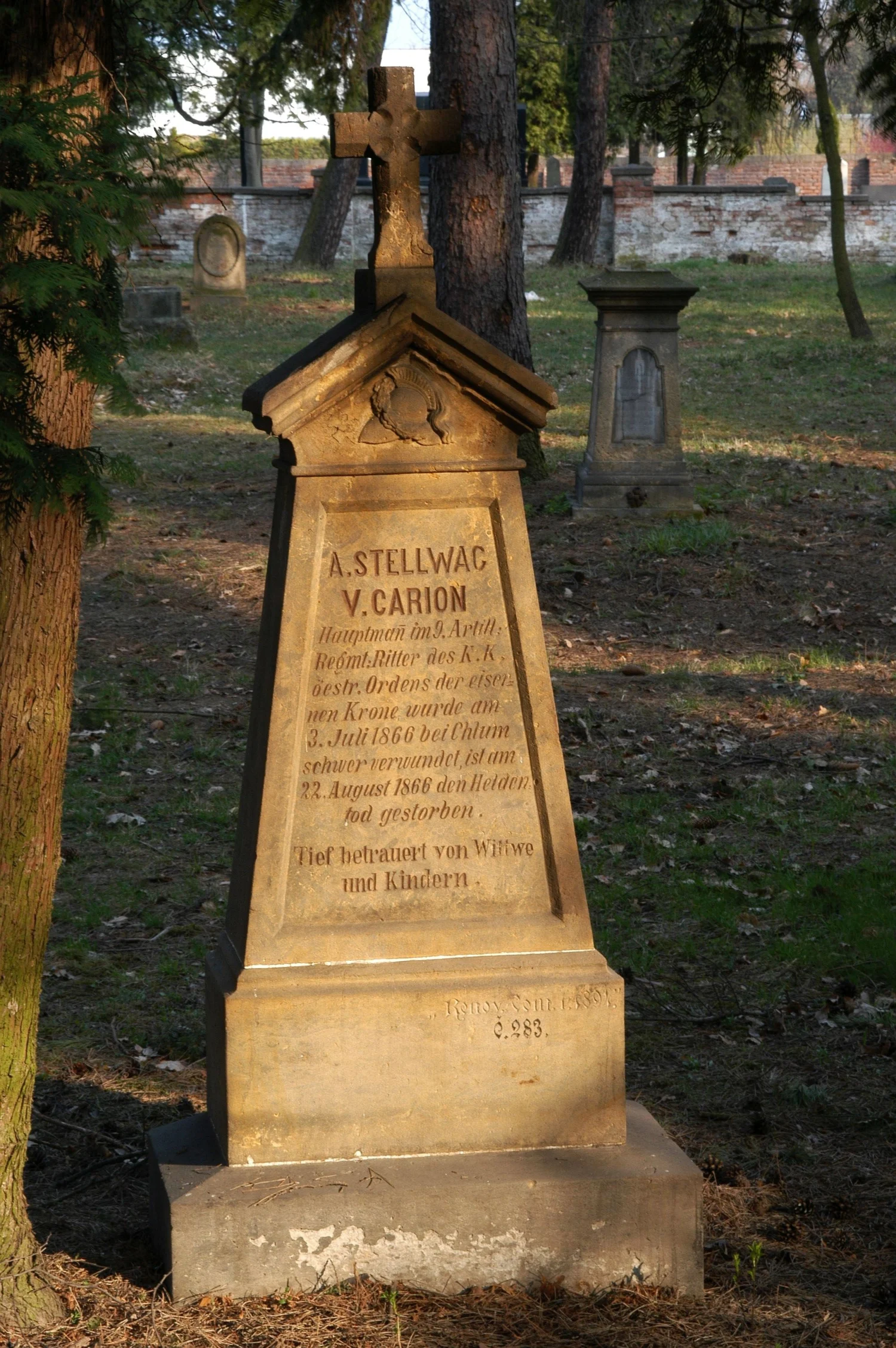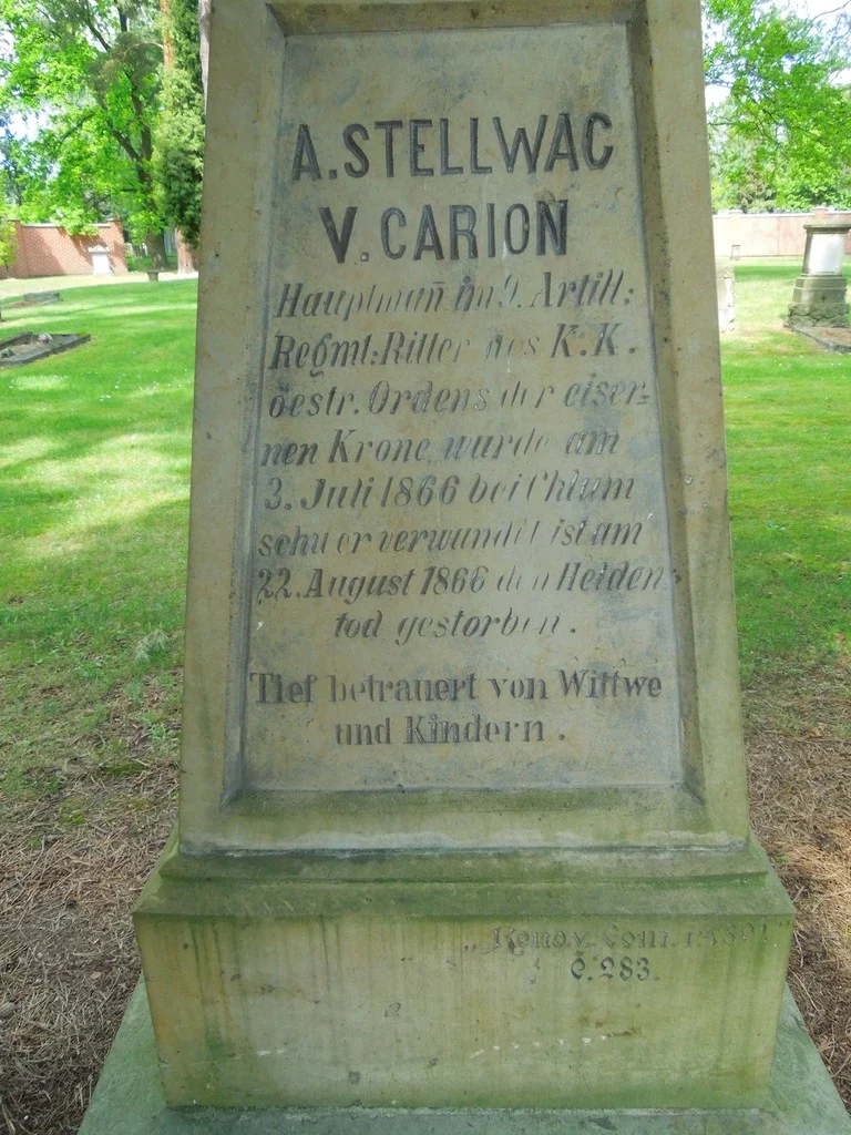 | Text na památce: | Čelní strana: \ A. STELLWAC V. CARION Hauptman im 9. Artill: Regmt: Ritter des K.K. öestr. Ordens der eiser= nen Krone wurde am 3. Juli 1866 bei Chlum schwer verwundet, ist am 22. August 1866 den Helden= tod gestorben. \ Tief betrauert von Wittwe und Kindern. \ „Renov. Com. r. 1894.“ Č. 283. \ |