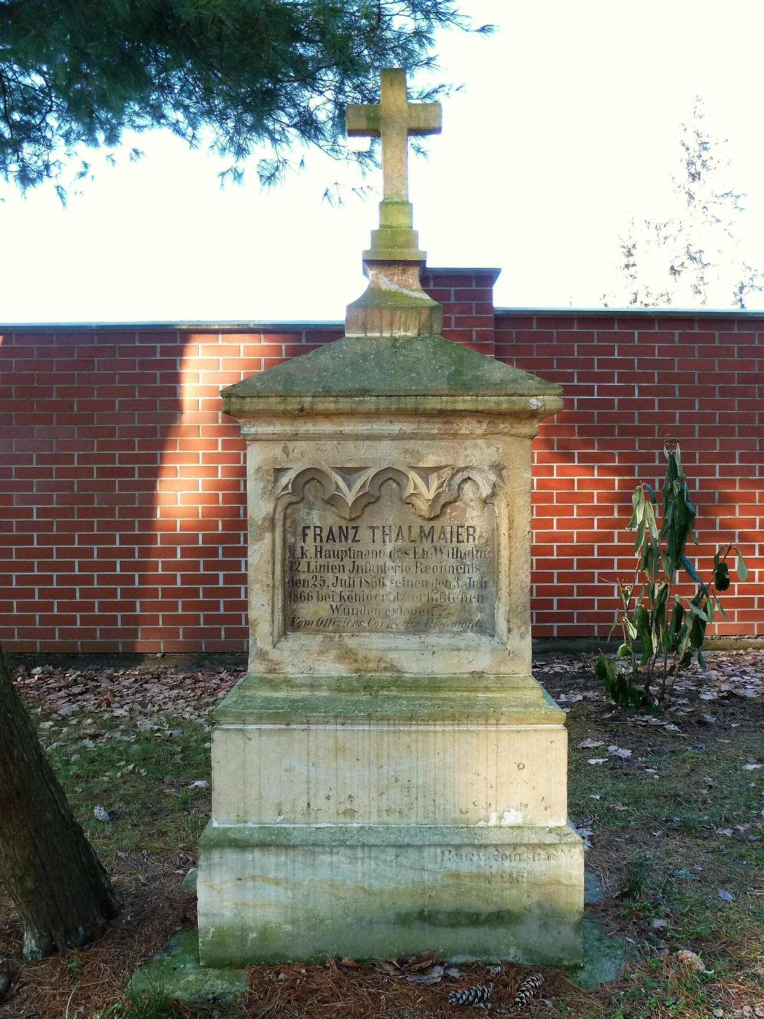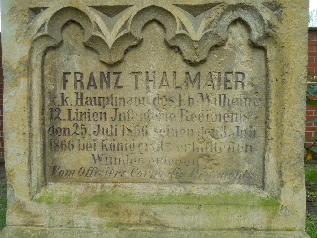 | Volný překlad: | Franz Thalmaier c. k. setník 12. řadového pěšího pluku arcivévody Wilhelma podlehl 25. července 1866 svému zranění utrpěnému 3. července 1866 u Hradce Králové. Od důstojnického sboru pluku. |