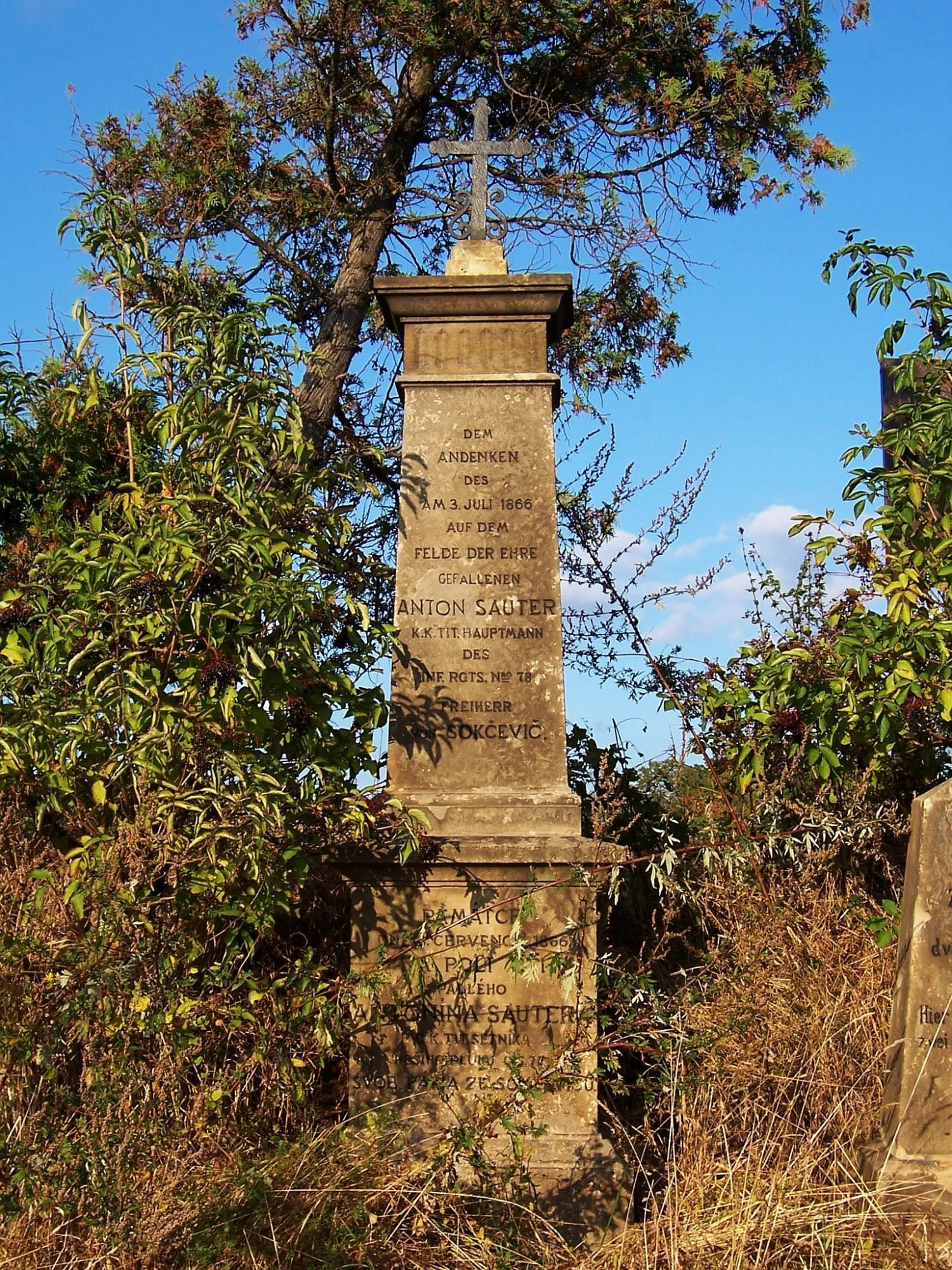 | Text na památce: | Čelní strana: \ DEM ANDENKEN DES AM 3. JULI 1866 AUF DEM FELDE DER EHRE GEFALLENEN ANTON SAUTER K. K. TIT. HAUPTMANN DES INF. RGTS. NRO 78 FREIHERR VON SOKČEVIČ. \ PAMÁTCE DNE 3. ČERVENCE 1866. NA POLI CTI PADLÉHO ANTONÍNA SAUTERA C. K. TIT. SETNÍKA PĚŠÍHO PLUKU ČÍS. 78 SVOB. PÁNA ZE SOKČEVIČŮ. \ Čís. 293. \ |