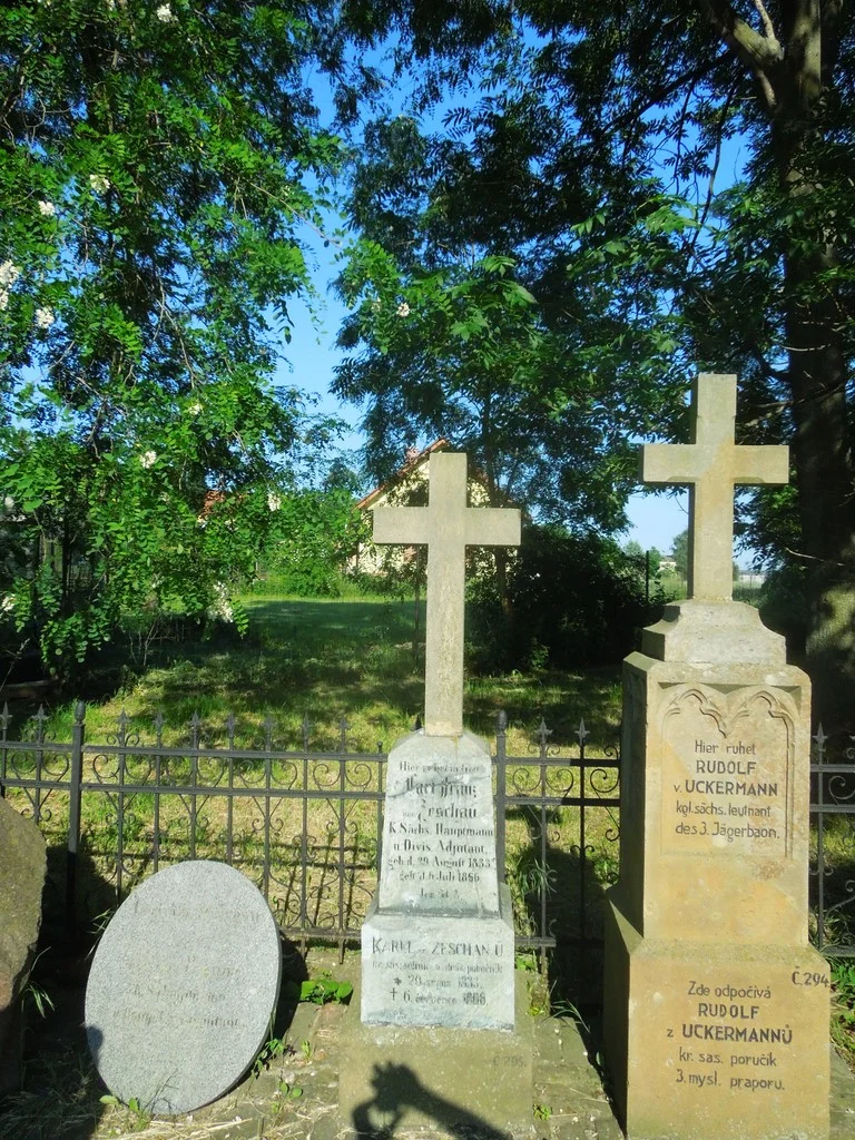 | Text na památce: | Čelní strana: \ Hier ruhet in Gott: Carl Franz von Zeschan K. Sächs. Hauptmann u. Divis. Adjutant, geb. d. 29. August 1833. gest. d. 6. Juli 1866. Jer. 31. 3. \ KAREL ZE ZESCHAN-Ů kr. sas. setnik a divis. pobočník * 29. srpna 1833. † 6. července 1866. \ Č.295. \ Dle foto – čelní strana hranolu (ve jménu): \ Carl Franz von Zeschau \ (ne Zeschan) \ |