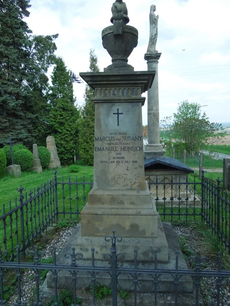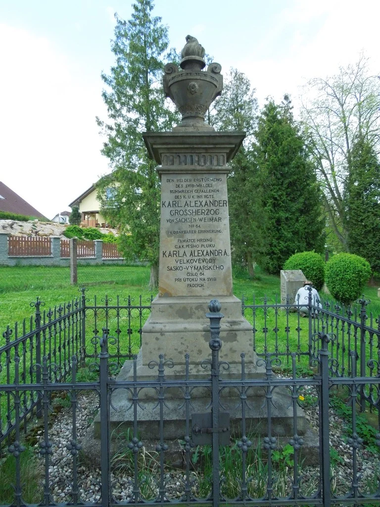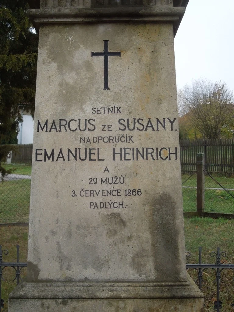 | Text na památce: | Čelní strana: \ SETNÍK MARCUS ZE SUSANY, NADPORUČÍK EMANUEL HEINRICH A 29 MUŽŮ 3. ČERVENCE 1866 PADLÝCH. \ Levá strana: \ DEN BEI DER ERSTÜRMONG DES SVIB – WALDES RUHMREICH GEFALLENEN DES K. U K. INF. RGTS. KARL ALEXANDER GROSSHERZOG VON SACHSEN – WEIMAR Nro 64. IN DANKBARER ERINNERUNG. \ PAMÁTCE HRDINŮ C. A K. PĚŠÍHO PLUKU KARLA ALEXANDRA, VELKOVÉVODY SASKO – VÝMARSKÉHO ČÍSLO 64. PŘI ÚTOKU NA SVÍB PADLÝCH. \ Zadní strana: \ HAUPTMANN MARCUS VON SUSANY, OBERLIEUTENANT EMANUEL HEINRICH UND 29 MANN. GEFALLEN AM 3. JULI 1866. \ Pravá dolní strana: \ Č. 297. \ |