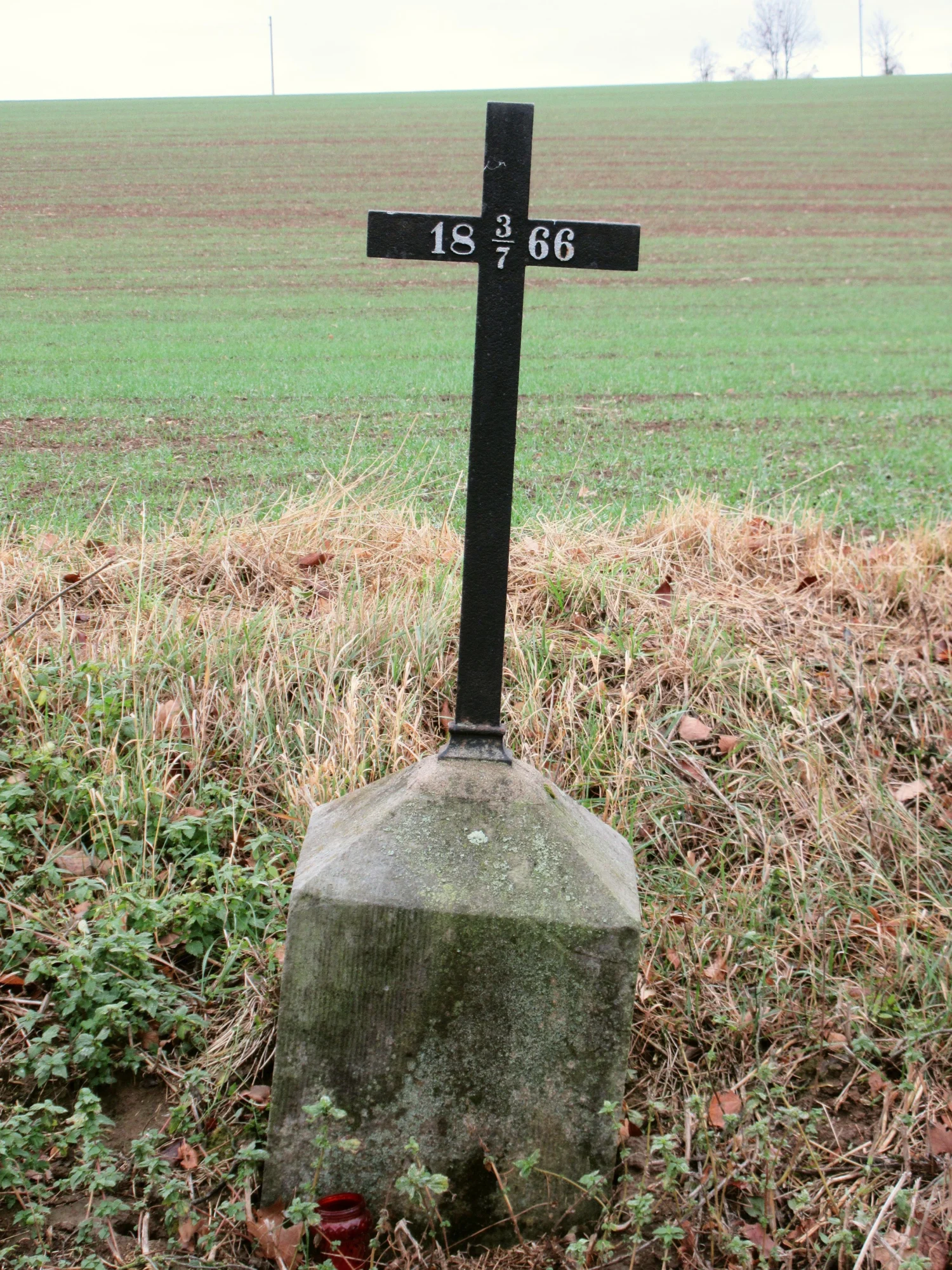 Památka s ostatky padlých a zemřelých vojáků, která stojí na původním místě; na památce není informace o pohřbených