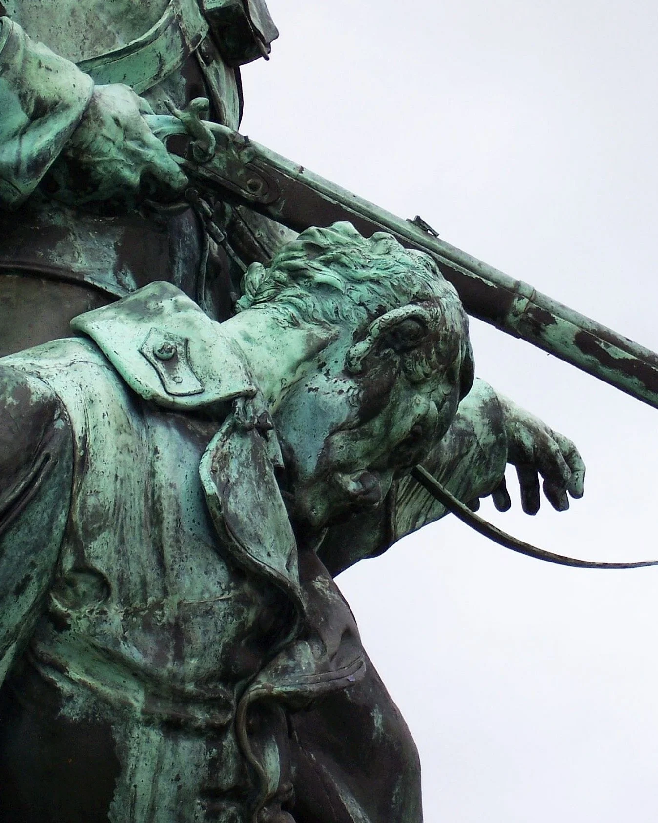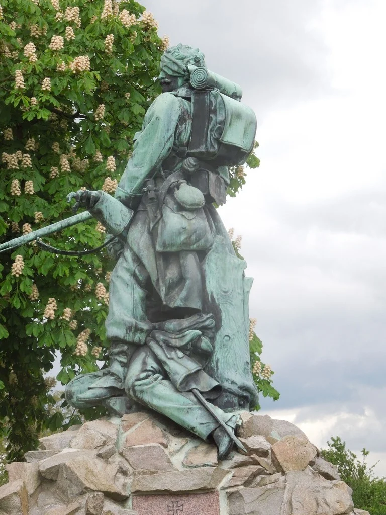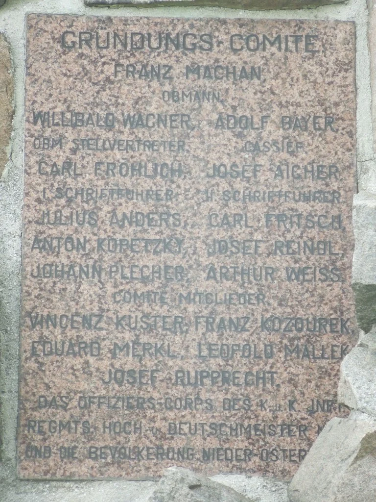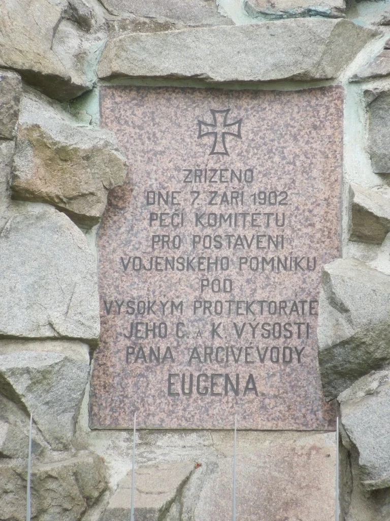 Postavy z tepané mědi, na skále 5. žulových desek s nápisy v českém a německém jazyce. Na zadní straně skály deska z břidlice. Kolem pomníku plůtek z puškových hlavní s nasazenými bodáky. Návrh Gustav von Lichtenberg. Sousoší vyrobila firma A. Nehr Vídeň, kamen. práce Fr. Slanec. Pomník odhalen 7. 9. 1902. Opravy: 2006 kamenná mohyly, 2008 vnitřního oploc., 2010 vnějšího oploc..