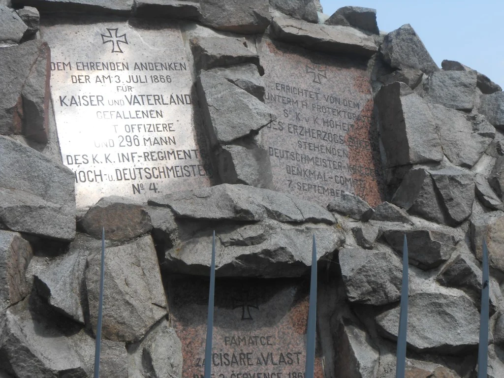 Sokl plastiky (levý přední roh): \ 1902 \ MODELL.V.LICHTENBERG IN KUPFER GETRIBEN VON ALEX. NEHR WIEN \ Čelní strana skaliska – levá horní deska: \ DEM EHRENDEN ANDENKEN DER AM 3. JULI 1866. FÜR KAISER UND VATERLAND GEFALLENEN ACHT OFFIZIERE UND 296 MANN DES K. K. INF.- REGIMENTS HOCH – U. DEUTSCHMEISTER No 4. \ Čelní strana skaliska – pravá horní deska: \ ERRICHTET VON DEM UNTERM H. PROTEKTORATE SR K. U. K. HOHEIT DES ERZHERZOGS EUGEN STEHENDEN DEUTSCHMEISTER – KRIEGER DENKMAL – COMITÉ. 7. SEPTEMBER 1902. \ Čelní strana skaliska – dolní nápisní deska: \ PAMÁTCE ZA CÍSAŘE A VLAST DNE 3. ČERVENCE 1866. PADLÝCH OSMI DŮSTOJNÍKŮ A 296 MUŽŮ C. K. PĚŠÍHO PLUKU Č. 4. \ Levá strana skaliska – nápisní deska: GRÜNDUNGS – COMITÉ FRANZ MACHAN OBMANN. Dva sloupce – levý sloupec: \ WILLIBALD WAGNER, OBM. STELLVERTRETER. CARL FRÖHLICH, I. SCHRIFTFÜHRER. JULIUS ANDERS, ANTON KOPETZKY, JOHANN PLECHER, \ pravý sloupec: \ ADOLF BAYER, CASSIER. JOSEF AICHER, II. SCHRIFTFÜHRER. CARL FRITSCH, JOSEF REINDL, ARTHUR WEISS, \ Uprostřed: \ COMITE MITGLIEDER. \ Dva sloupce – levý sloupec: \ VINCENZ KÜSTER, EDUARD MERKL, \ pravý sloupec: \ FRANZ KOZOUREK, LEOPOLD MALLEK, \ Uprostřed: \ JOSEF RUPPRECHT. \ DAS OFFIZIERS – CORPS DES K. U. K. INFT. REGMTS. HOCH – U. DEUTSCHMEISTER No 4. UND DIE BEVÖLKERUNG NIEDER ÖSTERREICHS. \ Zadní strana skaliska – nápisní deska: \ Pozemek pro tento pomník věnovala Obec Rozběřice. Das Denkmal – Grundstück vurde von der Gemeinde Rozběřic gewidmet. \ Pravá strana skaliska – nápisní deska: \ ZŘÍZENO DNE 7. ZÁŘÍ 1902 PÉČÍ KOMITÉTU PRO POSTAVENÍ VOJENSKÉHO POMNÍKU POD VYSOKÝM PROTEKTORÁTEM JEHO C. A K. VÝSOSTI PANA ARCIVÉVODY EUGENA. \