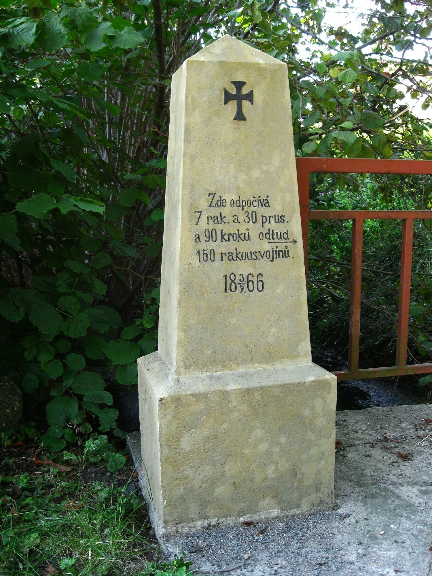 | Text na památce: | Čelní strana: \ Zde odpočívá 7 rak. a 30 prus. a 90 kroků odtud → 150 rakous.vojínů. 18 3./7. 66. \ Levá strana soklu: \ Kom. 1890. Č. 210. \ |