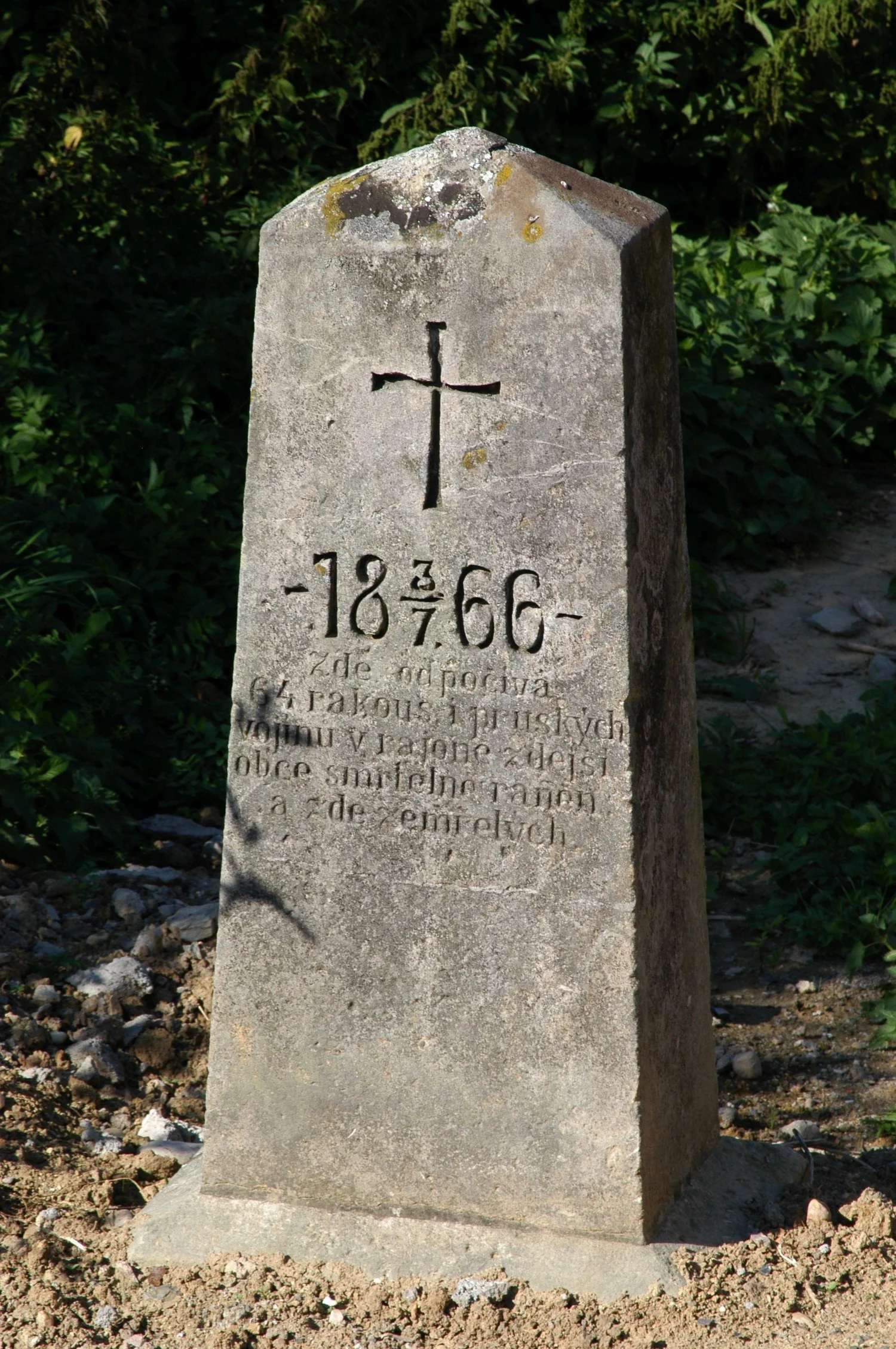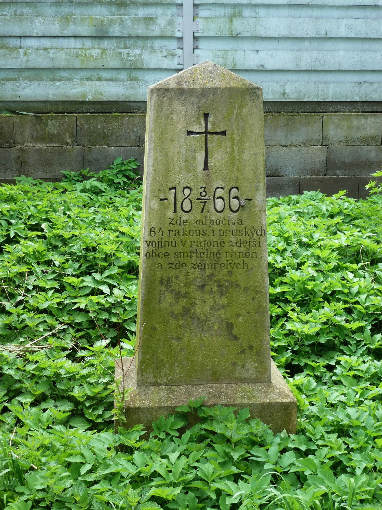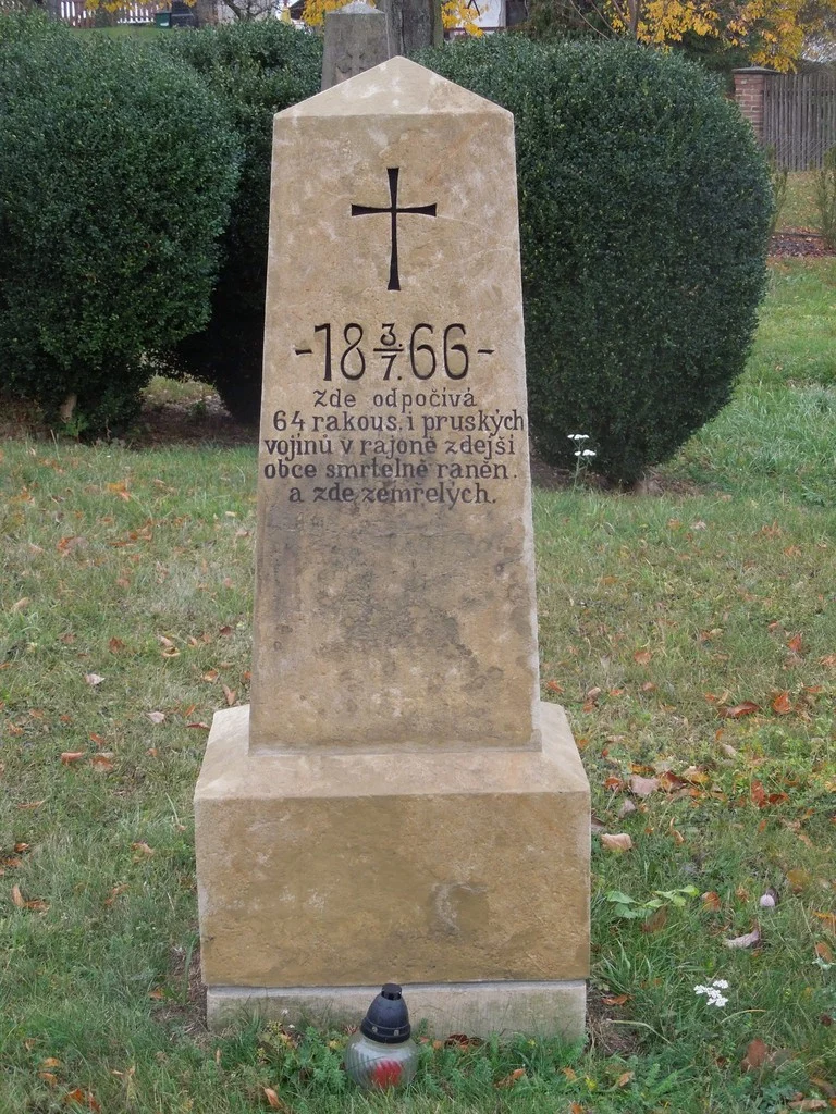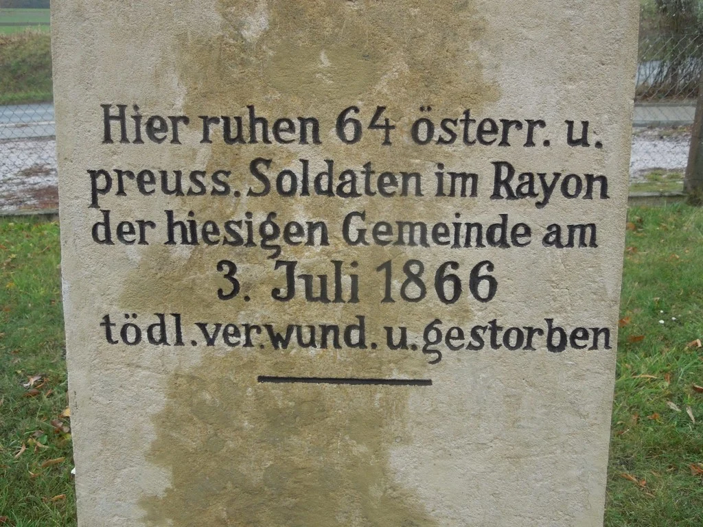 | Text na památce: | Přední strana: \ 18 3/7 66 Zde odpočívá 64 rakous. i pruských vojínů v rajoně zdejší obce smrtelně raněn. a zde zemřelých. \ Pravá strana: \ 403. \ Zadní strana: \ Hier ruhen 64 österr. u. preuss. Soldaten im Rayon der hiesigen Gemeinde am 3. Juli 1866 tödl. verwund. u. gestorben \ |