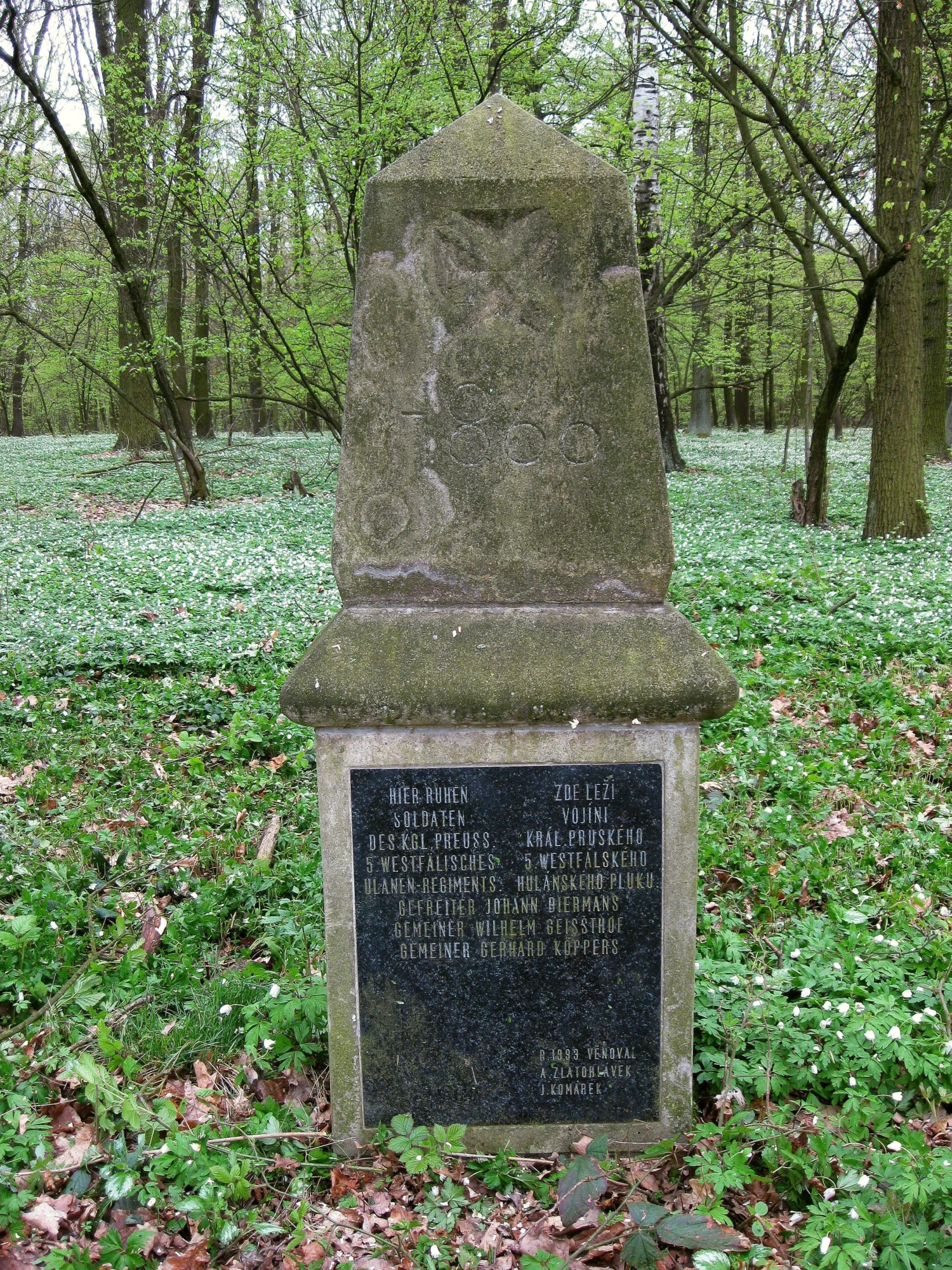 Čelní strana: \ 1866 Hier ruhen ↔ Zde leží Soldaten ↔ vojíni des kgl. Preuss. ↔ král. pruského 5. westfälisches ↔ 5. westfálského Ulanen-Regiments ↔ hulánského pluku Gefreiter Johann Biermans Gemeiner Wilhelm Geissthof Gemeiner Gerhard Köppers R. 1993 věnoval A. Zlatohlávek J. Komárek \