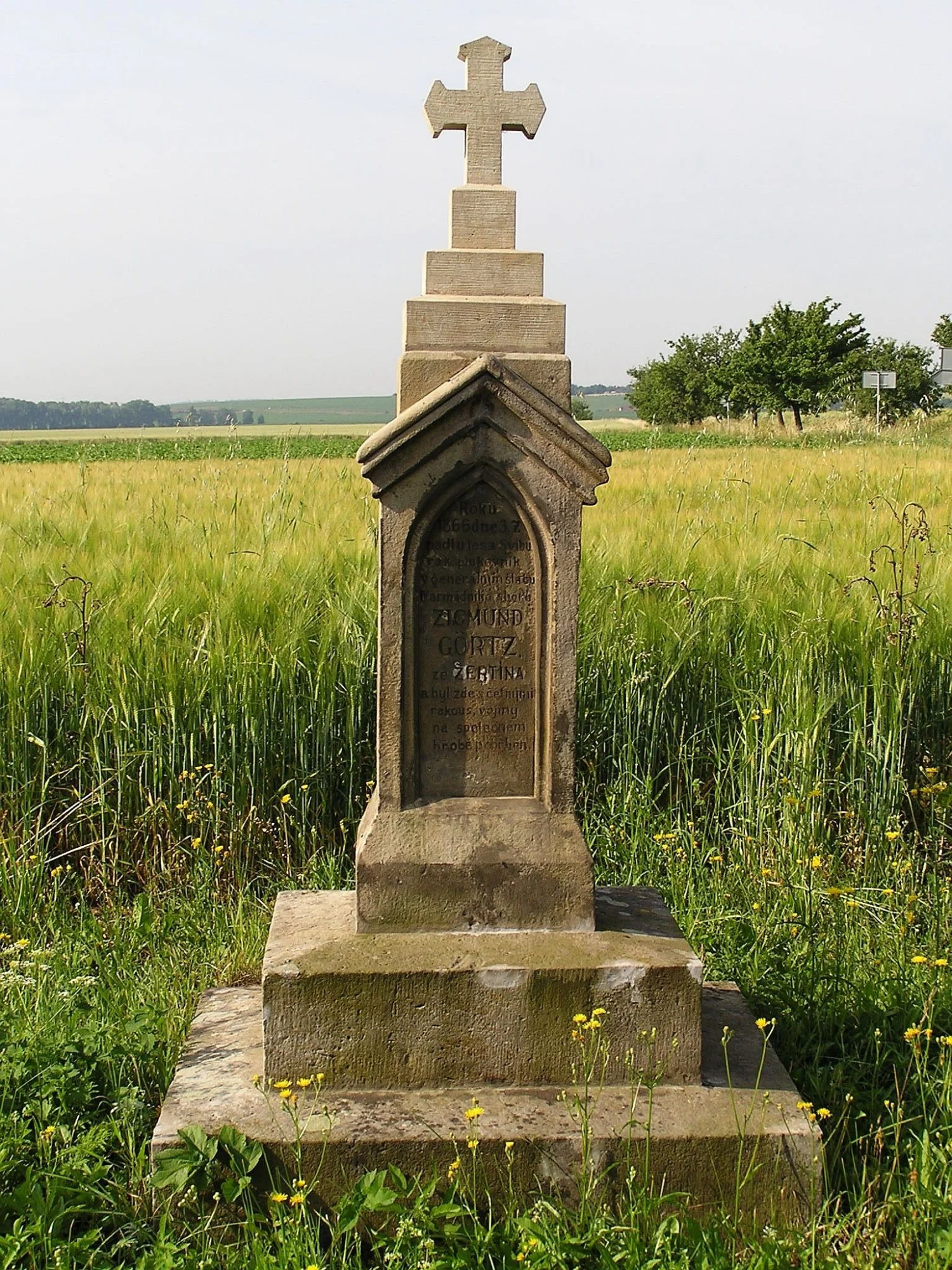 | Text na památce: | Čelní strana: \ Roku 1866 dne 3.7. padl u lesa Svíbu rak. plukovník v generálním štábu IV. armádního sboru ZIGMUND GÖRTZ, ze ŽERTÍNA a byl zde s četnými rakous. vojíny na společném hrobě pohřben. \ Levá strana: \ ← Hrob zde \ Zadní strana: \ O exhumaci plukovníkově viz záznam v obecní pamětní knize. \ |