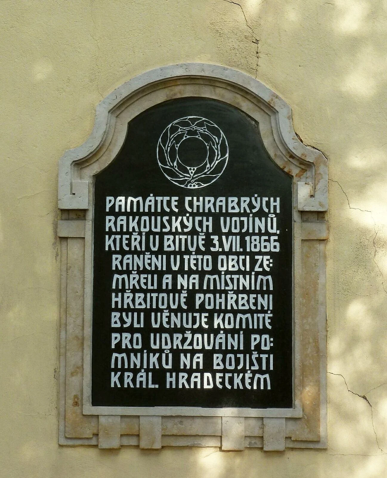 \ PAMÁTCE CHRABRÝCH RAKOUSKÝCH VOJÍNŮ, KTEŘÍ V BITVĚ 3. VII. 1866 RANĚNÍ V TÉTO OBCI ZE: MŘELI A NA MÍSTNÍM HŘBITOVĚ POHŘBENI BYLI VĚNUJE KOMITÉ PRO UDRŽOVÁNÍ PO: MNÍKŮ NA BOJIŠTI KRÁL. HRADECKÉM \
