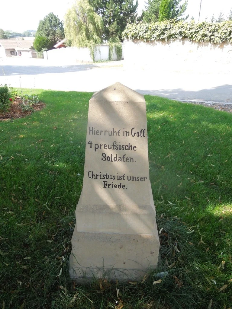 | Text na památce: | Čelní strana: \ Zde odpočívají 4 pruský vojínové. Kristus jest pokoj náš. 1866 3. Juli. \ Levá strana: \ 1866 \ Zadní strana: \ Hier ruht in Gott 4 preufsische Soldaten. Christus ist unser Friede. \ Pravá strana: \ 3. Juli \ |