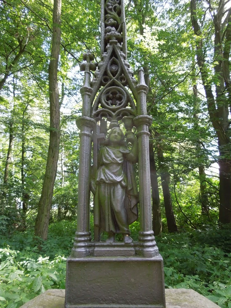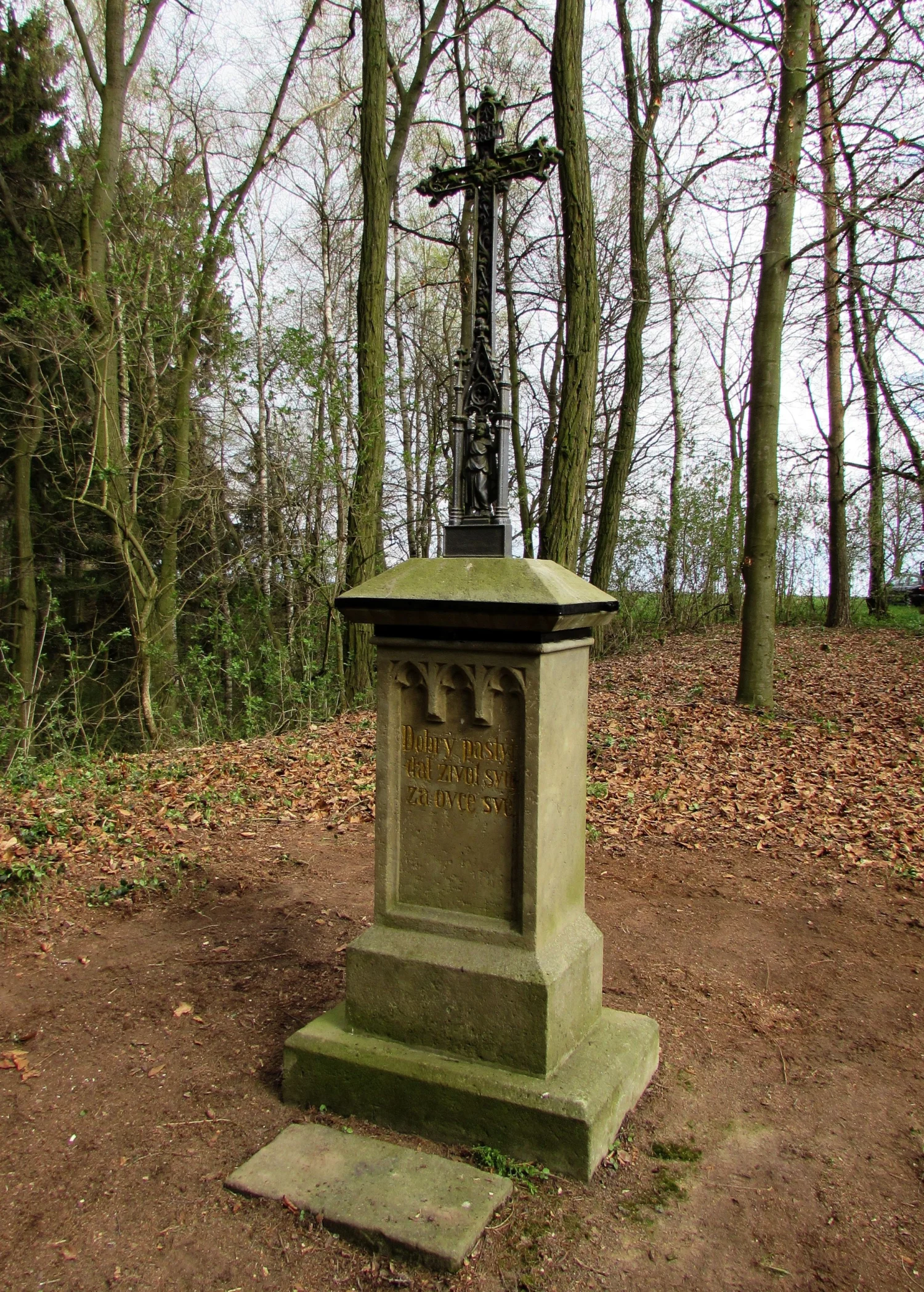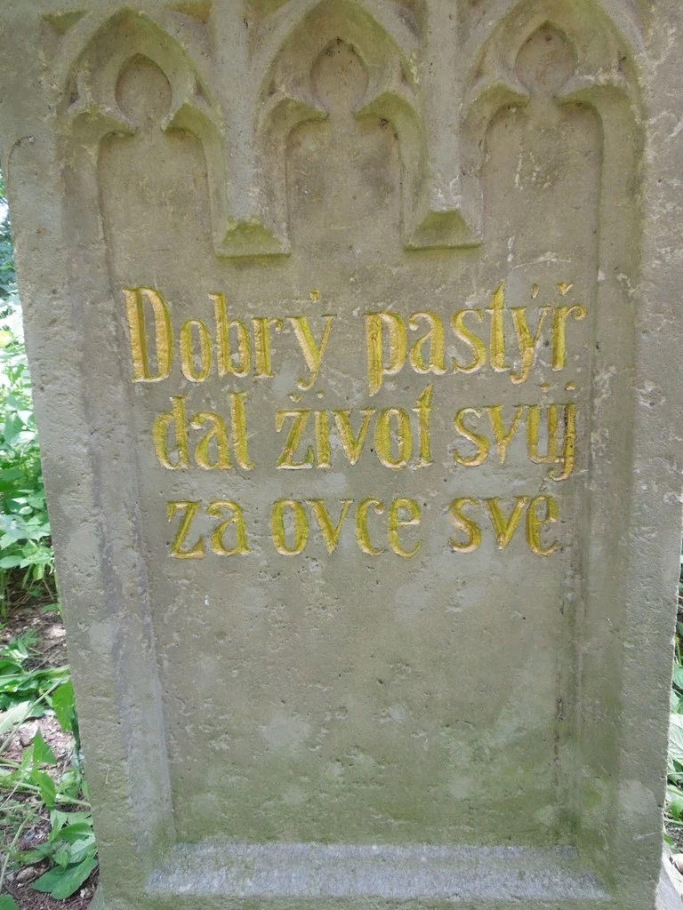 Gotizující pomník z pískovce s ozdobným litinovým křížem, s nápisem v českém jazyce