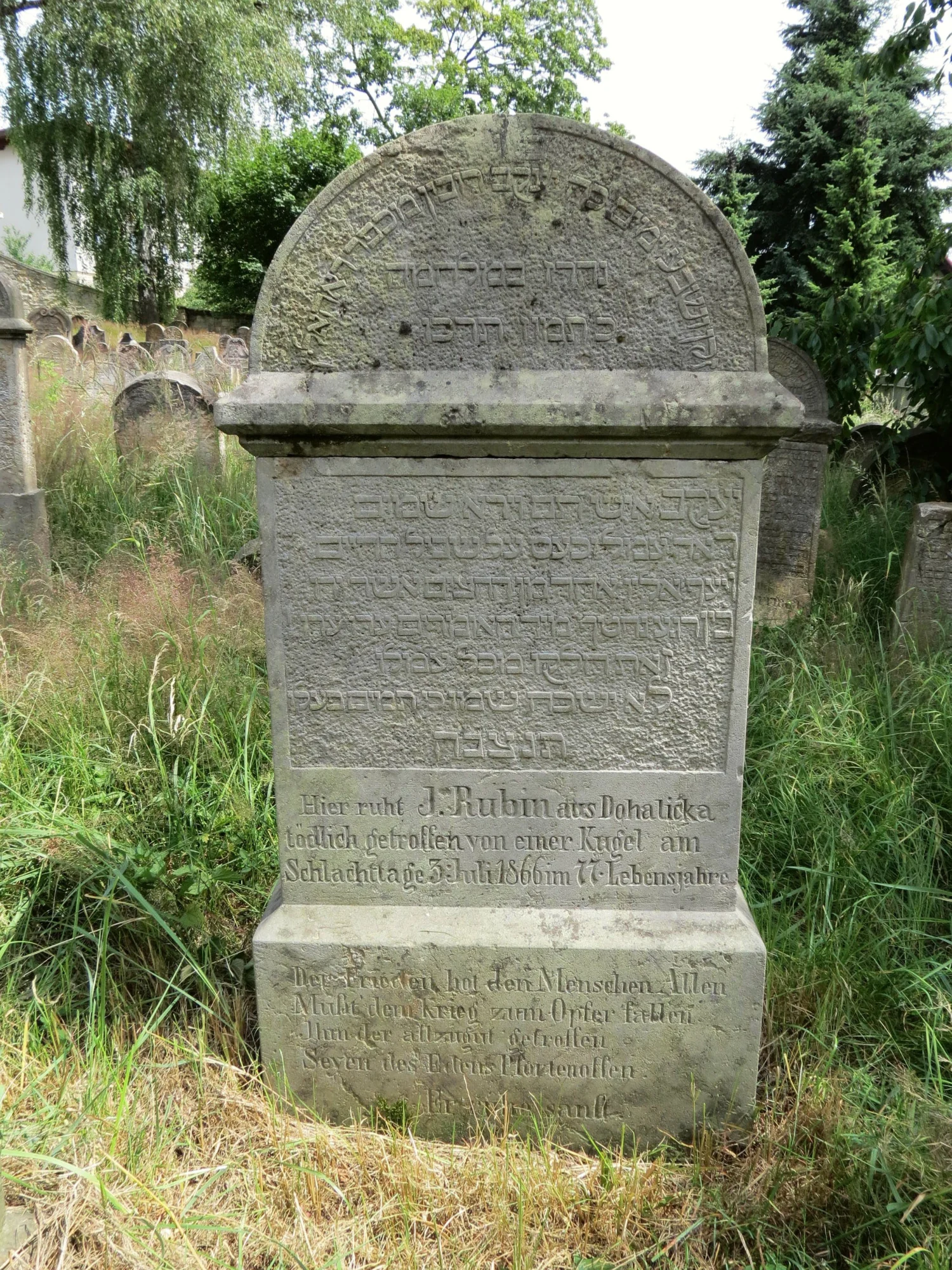 Čelní strana – pod hebrejským nápisem: \ Hier ruht J. Rubin aus Dohalicka tödlich getroffen von einer kugel am Schlachttage 3. Juli 1866 im 77 Lebensjahre. \ Der frieder hot den Menschen Allen MuSt dem Krieg zum Opfer fallen Ilun der allzugut getroffen Seven des Edens Pfortenoffen Er ruhe sanft.\ |