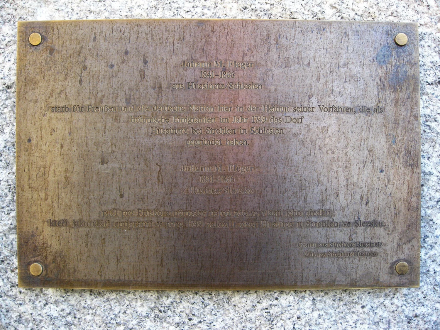 Čelní strana: \ Johann M. Fleger 1841-1866 aus Hussinetz / Schlesien starb für Preußen und die deutsche Nation hier in der Heimat seiner Vorfahren, die als böhmische Emigranten im Jahr 1749 das Dorf Hussinetz bei Strehlen in Schlesien gegründet haben. Johann M. Fleger 1841-1866 z Husince / Slezsko padl pro Prusko a německý národ zde ve vlasti jeho předků, kteří jako čeští emigranti v roce 1749 založili obci Husinec u Strehlen ve Slezsku. Granit aus Strehlen / Hussinetz Žula ze Strehlen / Husinec \