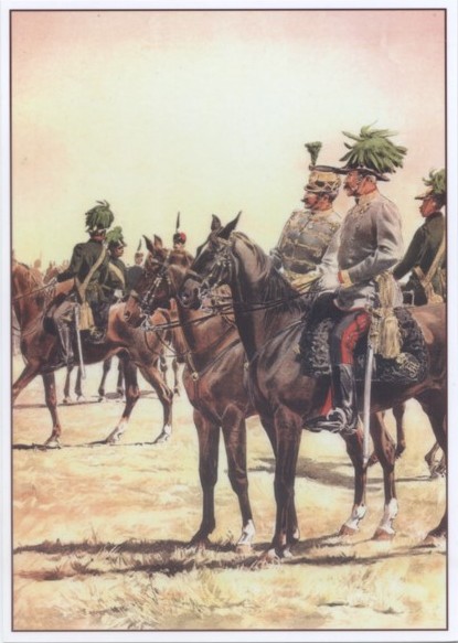 Rakouská generalita, zleva generál jízdy v husarské uniformě a polní podmaršálek. Podle známého vyobrazení Rudolfa Ottenfelda