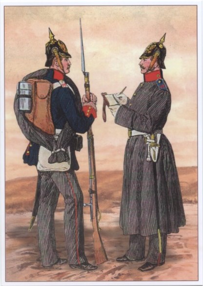 Mušketýr a šikovatel pruského 5. pomořanského pluku č. 42 na dobovém vyobrazení