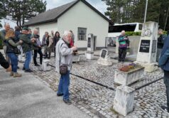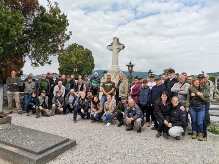 Od hlavní brány ústředního hřbitova jsme se nakonec ještě vydali cestou zvanou Zehngrafweg na okraj sídliště v Kaiserebersdorfu, kde je velmi pěkně udržovaný kříž na hrobě 40 vojáků 74. pěšího pluku, kteří v místních kasárnách zemřeli v srpnu 1866 na choleru. Na nedaleké Thürnlhofstraße jsme nastoupili do našeho autobusu, který nás odvezl do Deutsch-Wagramu, kde jsme exkurzní den zakončili prohlídkou figurálního pomníku bitvy u Wagramu 5.–6. 7. 1809 zobrazujícího granátníka 42. pěšího pluku a nedaleké kaple stojící na původním hřbitově a pomníčku upomínajícího na vytyčení demarkační linie mezi pruským a rakouským vojskem v roce 1866.